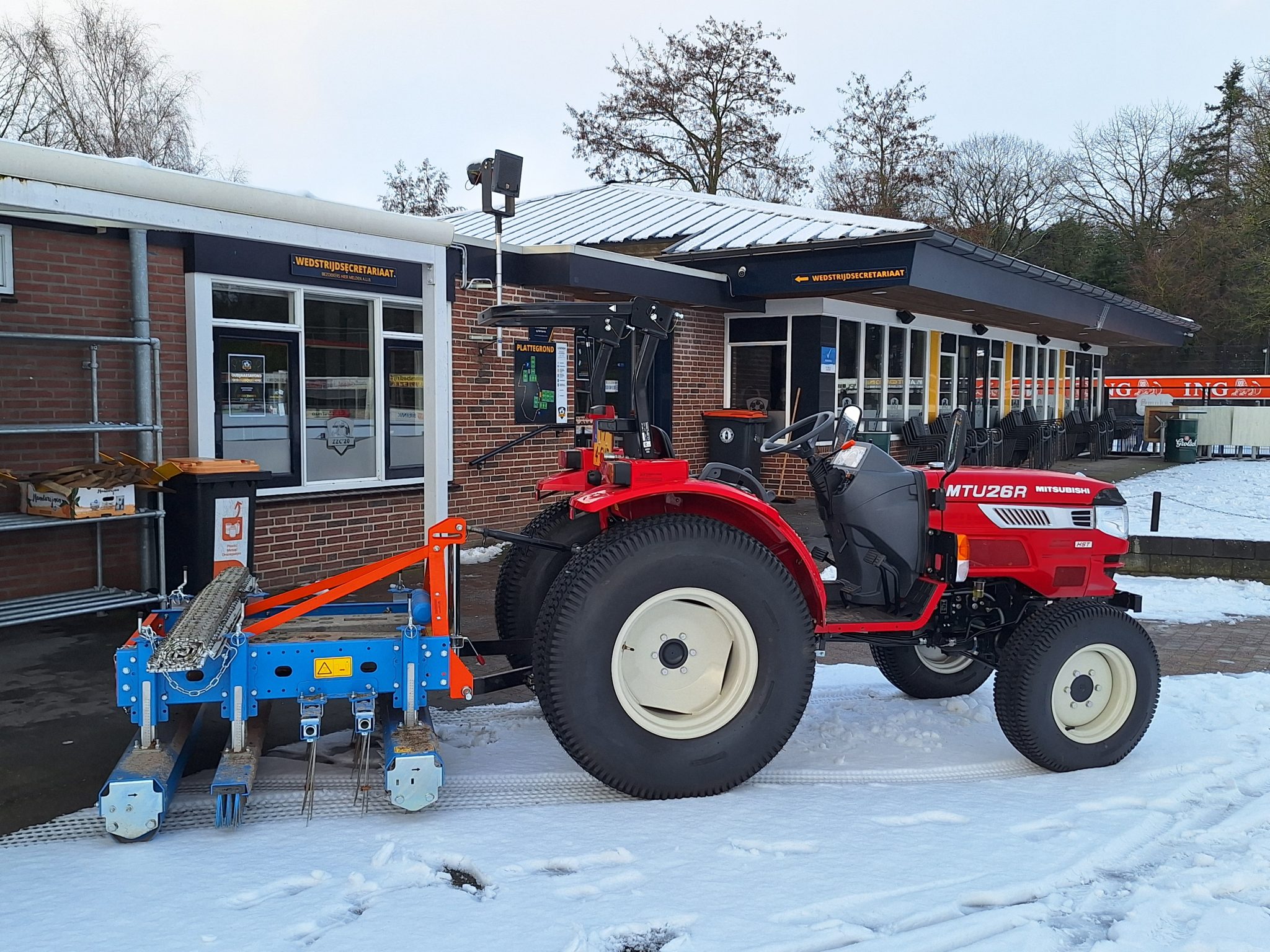De bijdrage van € 10.000,= is bedoeld voor de traktor en combimachine die wordt gebruikt voor het veldonderhoud. De traktor stond buiten in de sneeuw en is door ons vastgelegd op een foto.